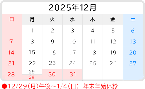12月29日(月)午後~1月4日(日)まで年末年始休診です。